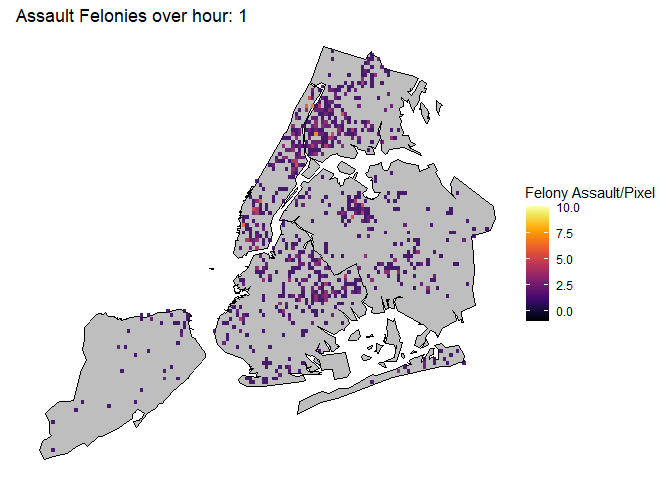filter <- df_geo$OFNS_DESC =='FELONY ASSAULT'p <-ggplot() +geom_polygon(data=nyc_map, aes(x = long, y = lat, group = group),fill ="grey", color ="black") +geom_bin2d(data=df_geo[filter, ], aes(x = Longitude, y = Latitude), binwidth =c(0.004, 0.004), alpha=0.9) +scale_fill_gradientn(colors =inferno(100), name ="Felony Assault/Pixel",limits =c(-1, 10)) +coord_fixed(ratio =1.2) +labs(title ="Assault Felonies over hour: {frame}") +theme_void()# Here comes the gganimate specific bitsanimated_plot <- p +transition_manual(Hour) +enter_fade() +exit_fade()animate(animated_plot)
