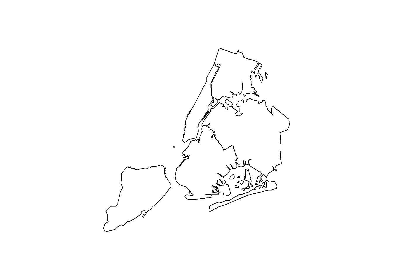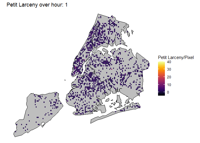 filter <- df_geo$OFNS_DESC =='PETIT LARCENY'p <-ggplot() +geom_polygon(data=nyc_map, aes(x = long, y = lat, group = group),fill ="grey", color ="black") +geom_bin2d(data=df_geo[filter, ], aes(x = Longitude, y = Latitude), binwidth =c(0.004, 0.004), alpha=0.9) +scale_fill_gradientn(colors =inferno(100), name ="Petit Larceny/Pixel",limits =c(-5, 40)) +coord_fixed(ratio =1.2) +labs(title ="Petit Larceny over hour: {frame}") +theme_void() # Here comes the gganimate specific bitsanimated_plot <- p +transition_manual(Hour) +enter_fade() +exit_fade()animate(animated_plot)