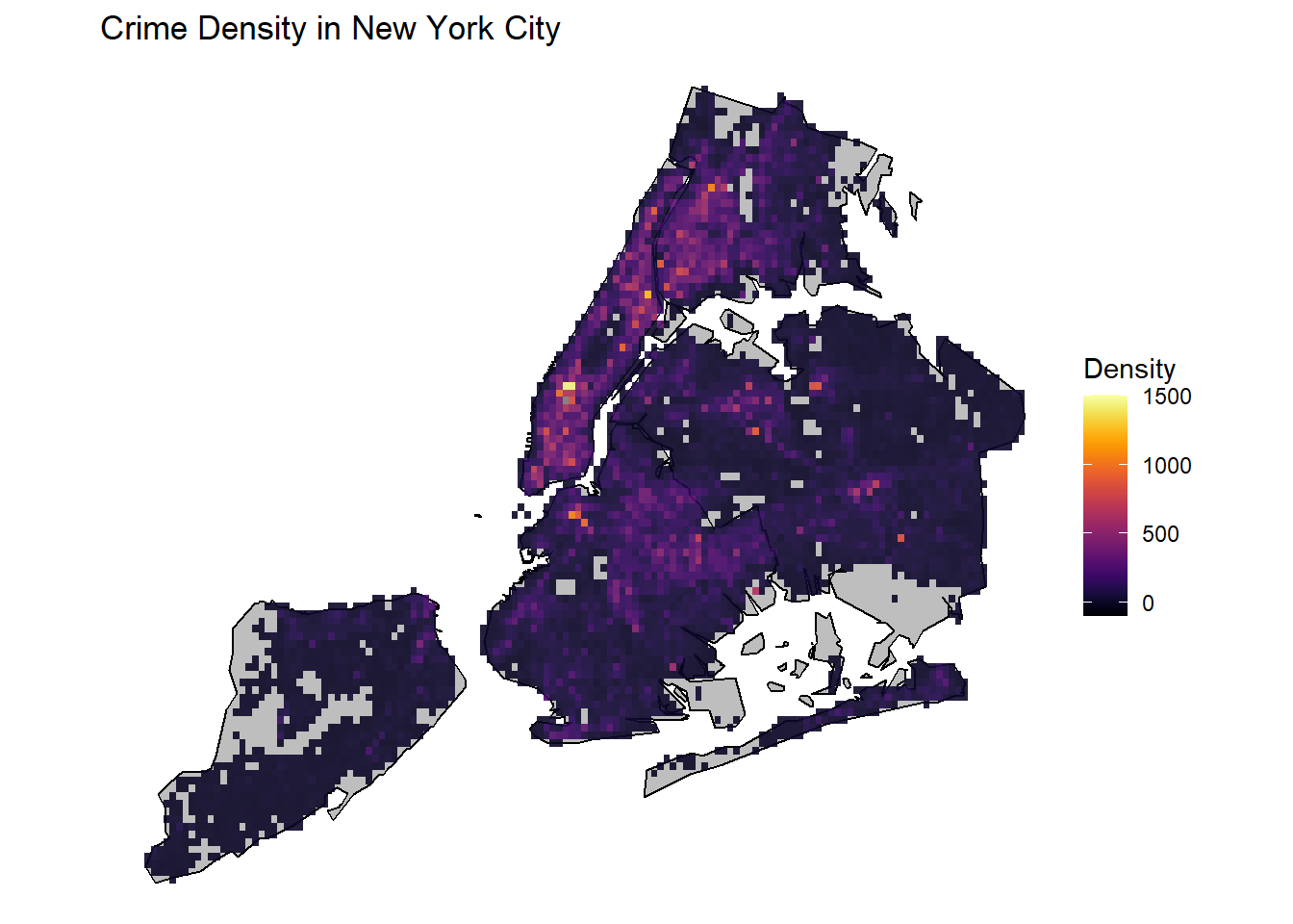ggplot() +geom_polygon(data=nyc_map, aes(x = long, y = lat, group = group),fill ="grey", color ="black") +geom_bin2d(data=df_geo, aes(x = Longitude, y = Latitude), binwidth =c(0.004, 0.004), alpha=0.9) +scale_fill_gradientn(colors =inferno(100), name ="Density",limits =c(-100, 1500)) +coord_fixed(ratio =1.2) +labs(title ="Crime Density in New York City") +theme_void()