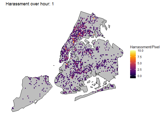 filter <- df_geo$OFNS_DESC =='HARRASSMENT 2'p <-ggplot() +geom_polygon(data=nyc_map, aes(x = long, y = lat, group = group),fill ="grey", color ="black") +geom_bin2d(data=df_geo[filter, ], aes(x = Longitude, y = Latitude), binwidth =c(0.004, 0.004), alpha=0.9) +scale_fill_gradientn(colors =inferno(100), name ="Harrassment/Pixel",limits =c(-1, 10)) +coord_fixed(ratio =1.2) +labs(title ="Harassment over hour: {frame}") +theme_void() # Here comes the gganimate specific bitsanimated_plot <- p +transition_manual(Hour) +enter_fade() +exit_fade()animate(animated_plot)