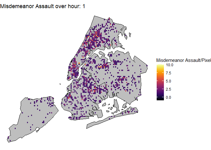 filter <- df_geo$OFNS_DESC =='ASSAULT 3 & RELATED OFFENSES'p <-ggplot() +geom_polygon(data=nyc_map, aes(x = long, y = lat, group = group),fill ="grey", color ="black") +geom_bin2d(data=df_geo[filter, ], aes(x = Longitude, y = Latitude), binwidth =c(0.004, 0.004), alpha=0.9) +scale_fill_gradientn(colors =inferno(100), name ="Misdemeanor Assault/Pixel",limits =c(-1, 10)) +coord_fixed(ratio =1.2) +labs(title ="Misdemeanor Assault over hour: {frame}") +theme_void() # Here comes the gganimate specific bitsanimated_plot <- p +transition_manual(Hour) +enter_fade() +exit_fade()animate(animated_plot)