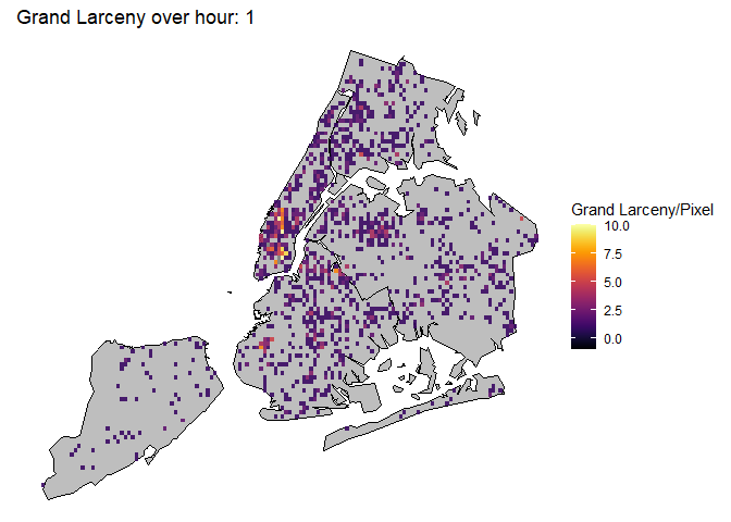 filter <- df_geo$OFNS_DESC =='GRAND LARCENY'p <-ggplot() +geom_polygon(data=nyc_map, aes(x = long, y = lat, group = group),fill ="grey", color ="black") +geom_bin2d(data=df_geo[filter, ], aes(x = Longitude, y = Latitude), binwidth =c(0.004, 0.004), alpha=0.9) +scale_fill_gradientn(colors =inferno(100), name ="Grand Larceny/Pixel",limits =c(-1, 10)) +coord_fixed(ratio =1.2) +labs(title ="Grand Larceny over hour: {frame}") +theme_void()# Here comes the gganimate specific bitsanimated_plot <- p +transition_manual(Hour) +enter_fade() +exit_fade()animate(animated_plot)