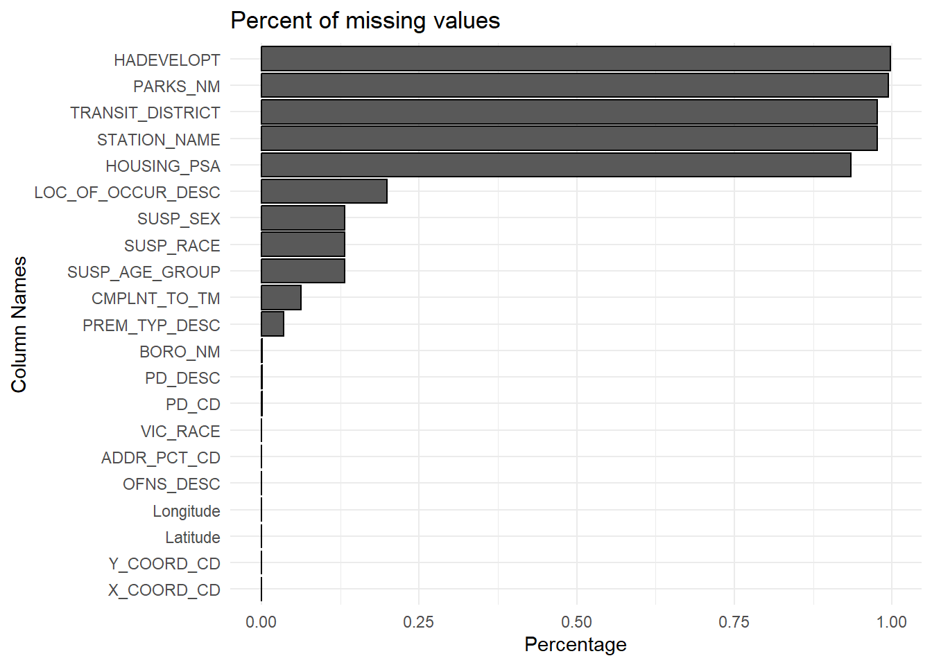labs(title = "Percent of missing values", x = "Column Names", y = "Percentage") +