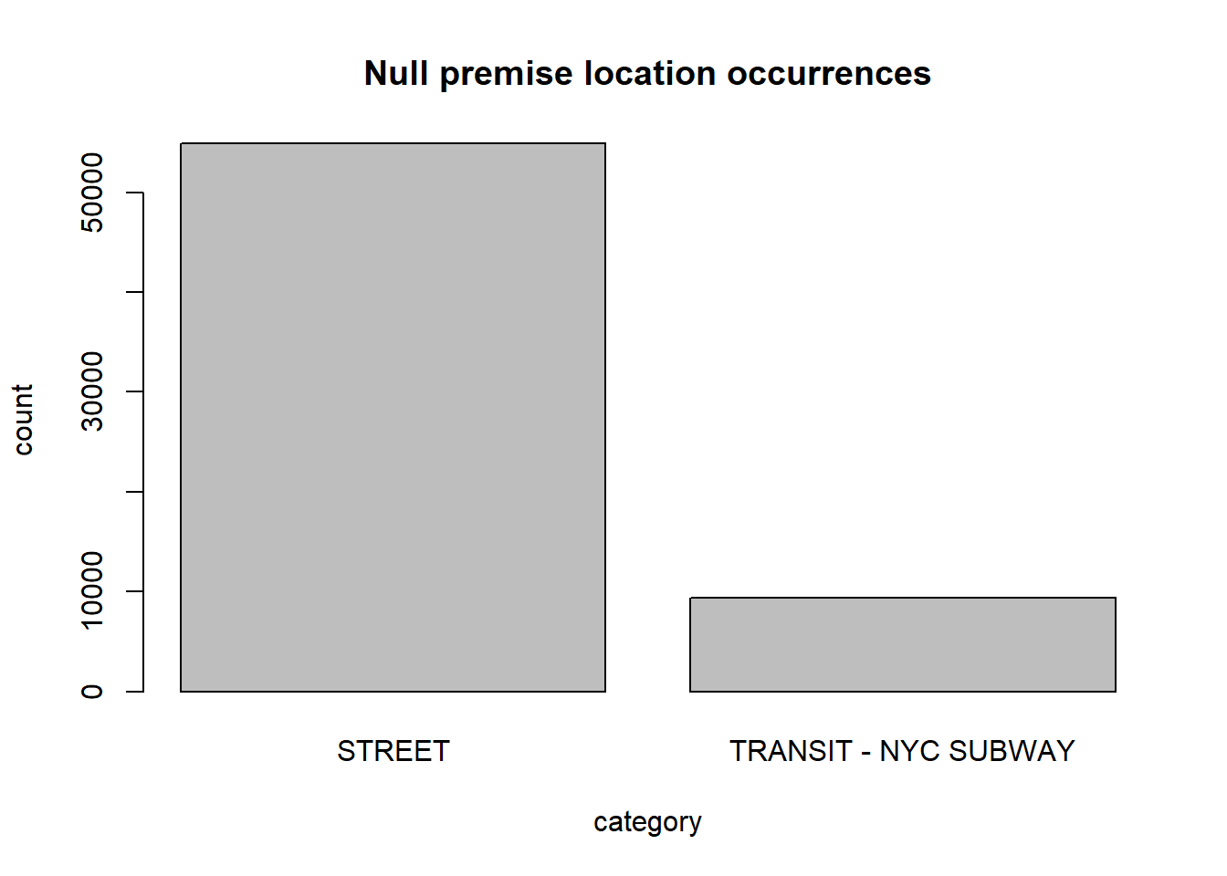Loc_of_occur_desc indicates if a crime occurred inside, in front of, or behind a premise. We noticed the null values happen when the premise is either the street or an NYC subway, so the exact location around the premises doesn’t make sense. We can probably drop this column since the information is not that useful.