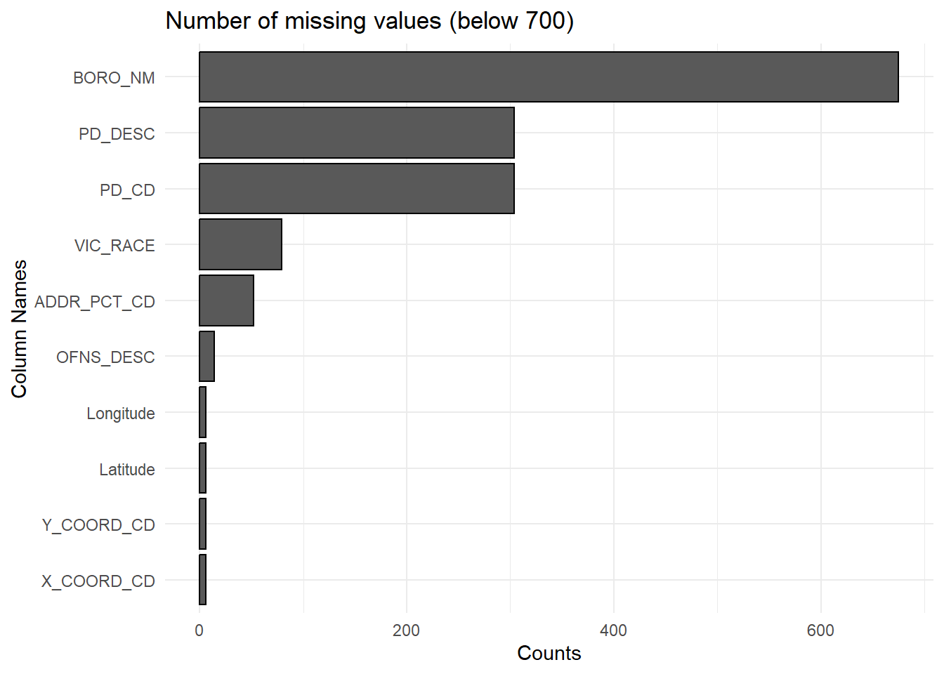 labs(title = "Number of missing values (below 700)", x = "Column Names", y = "Counts") +